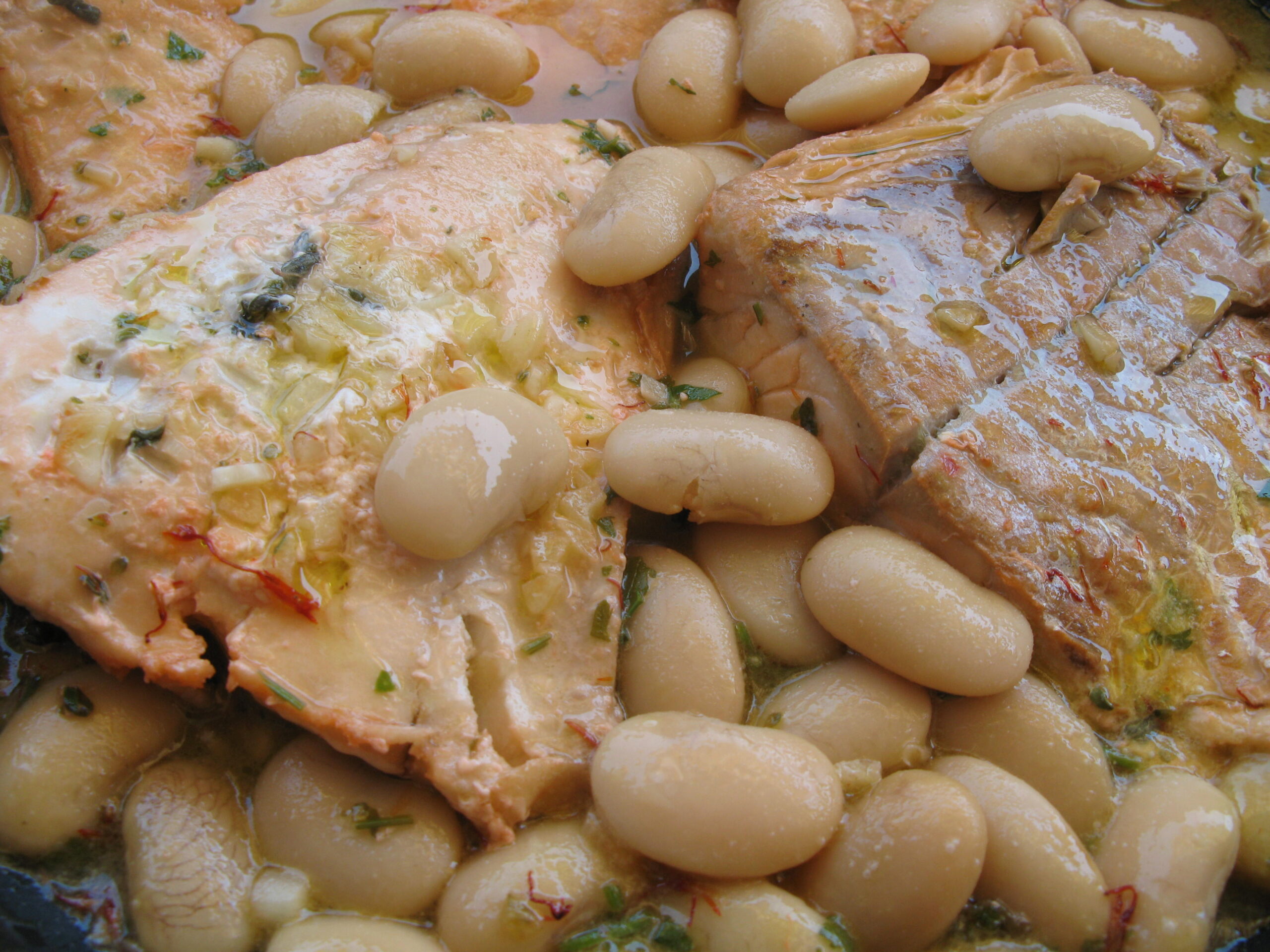 Usoljeni bakalar preko noći u hladnjaku odslanite mijenjajući par puta vodu a zamrznute filete odmrznite i dobro ocijedite. Tri žlice kuhanog fažola stavite sa strane pa ga zdrobite vilicom i podlijte s malo temeljca ili mlake vode. U većoj tavi ili u plitkoj teći (plitkom woku) na malo maslinova ulja šufigajte kapulu rezanu na listiće s pola peršina pa dodajte preostali ocijeđeni grah, origano, bijelo vino, šafran, zgnječeni grah s temeljcem te sol i papar. Držite na srednje jakoj vatri dok se tekućina ne reducira a umak malo zgusne. U međuvremenu na grill tavi ili gradelama popecite odreske bakalara nakapane s malo maslinova ulja pa ih složite na tanjur a preko njih dodajte preostali grah u toplom umaku. Po volji pospite s malo peršina i dodatno začinite solju, paprom i maslinovim uljem.