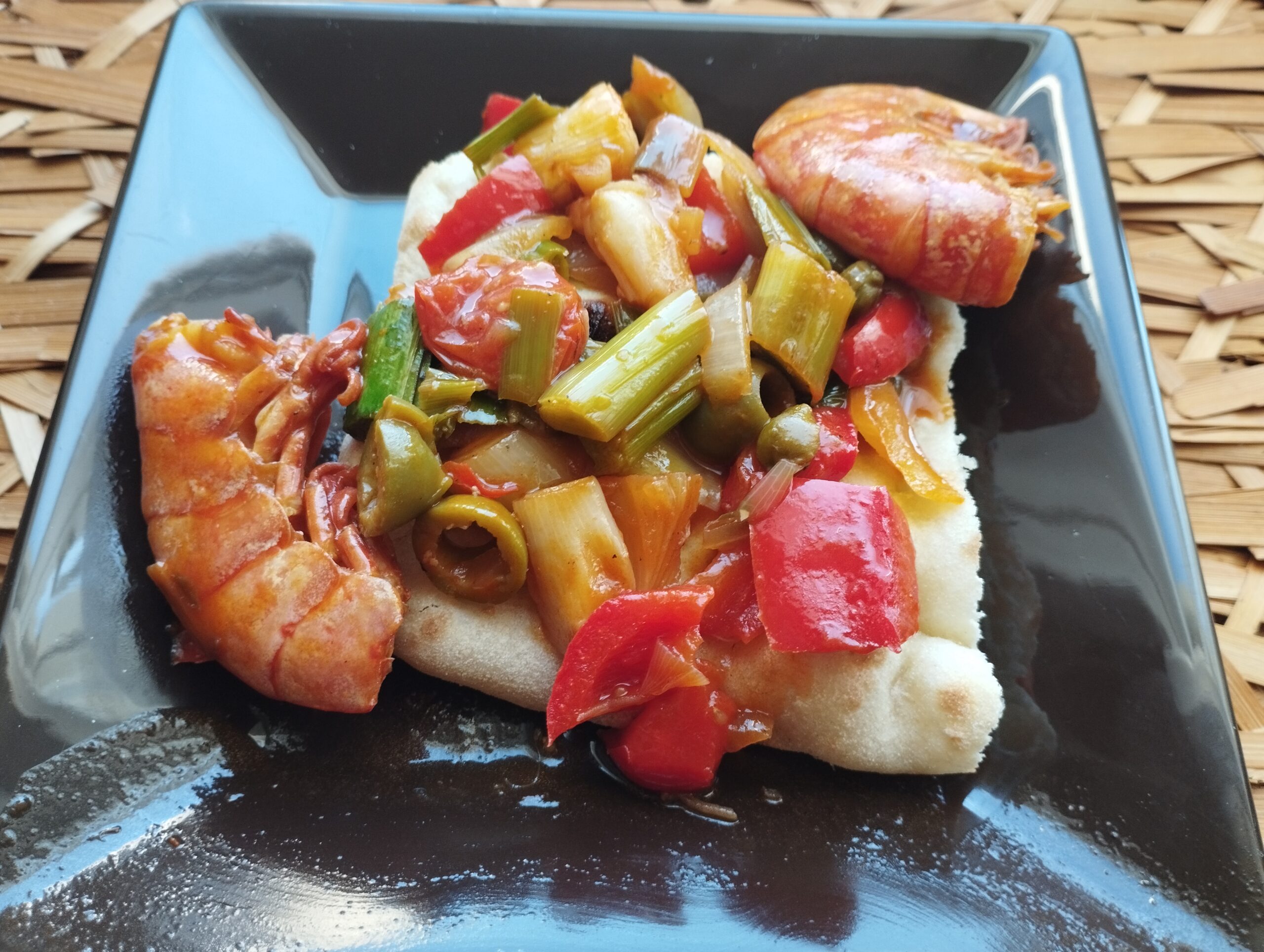 Povrće operite, posušite pa na laganoj vatri u dubljoj tavi pirjajte/šufigajte na maslinovom ulju. Nakon nekoliko minuta dodajte bijelo vino i malo vrele vode te sol, papar, peršin i repove kozica. Uz povremeno miješanje držite na srednje jakoj vatri dok se tekućina nije skroz reducirala. Na tanku focacciu (možete koristiti već gotovu iz pekare i boljih dućana koju ćete uzdužno prerezati na pola) ili kruh za tramezine složite povrće a uz njega (ili preko njega) repove velikih kozica. Po volji nakapajte još malo ulja i pospite s malo peršina.