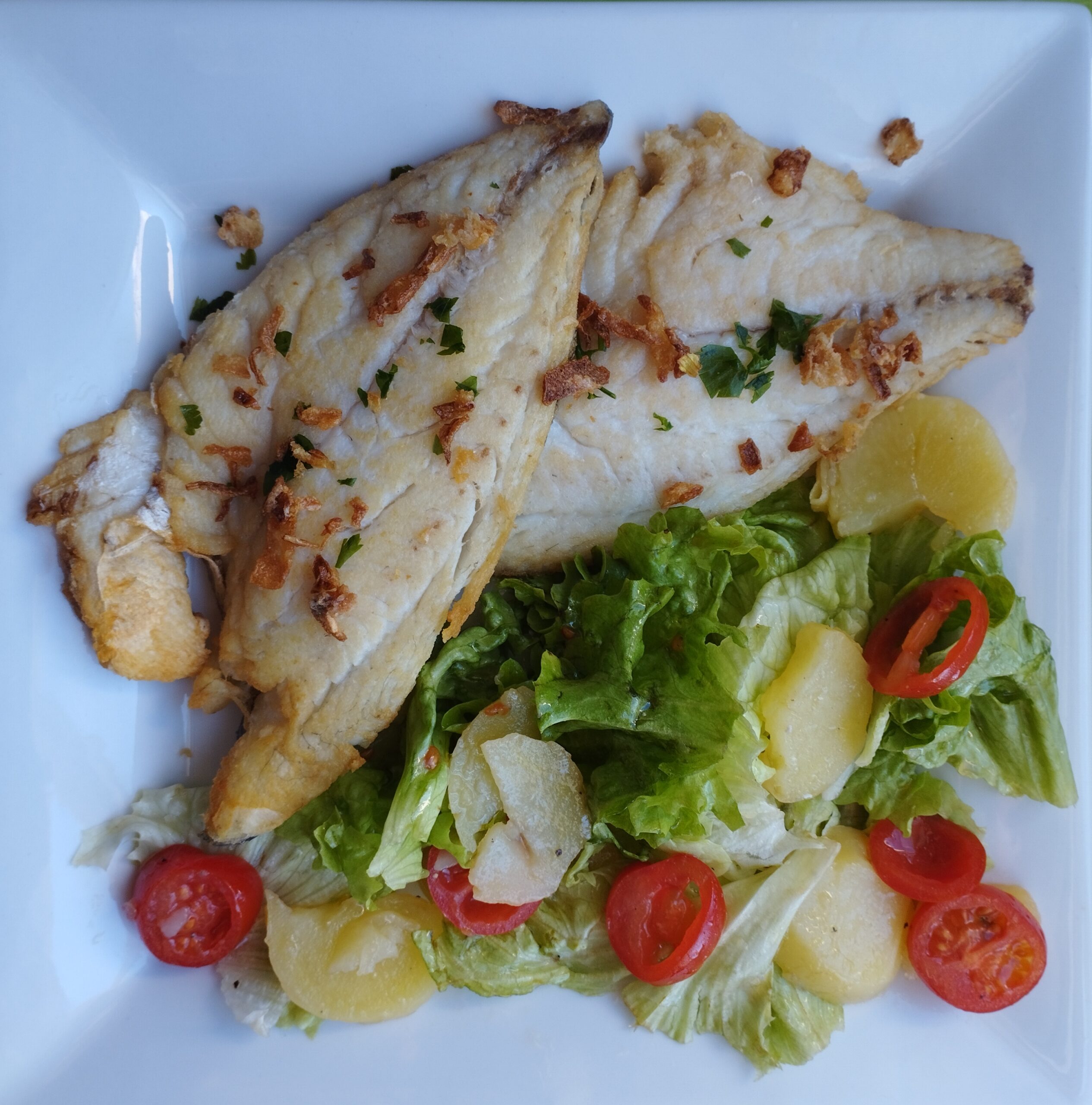 Komarče očistite, odstranite im glave (spremite ih jer dobro dođu za riblju juhu ili temeljac) pa odvojite filete. Skinite kožu koju možete odvojeno popržiti pa ju – po volji – kao čips razmrviti i dodati preko prženih fileta. Skuhajte krumpir u ljusci pa ga kad se ohladio ogulite i narežite na fete. Dodajte ga u zdjelu za salatu zajedno sa cherry rajčicama i zelenom salatom. Na lagano nauljenoj tavi najprije na jačoj a potom srednje jakoj vatri s obje strane ispecite lagano pobrašnjene filete ribe. Stavite ih na kuhinjski papir da se ocijede od viška ulja pa stavite na tanjur. Začinite salatu maslinovim uljem i kvasinom , posolite i popaprite pa služite uz filete. Po volji pospite filete karameliziranom kapulom i smrvljenim čipsom od frigane riblje kože.