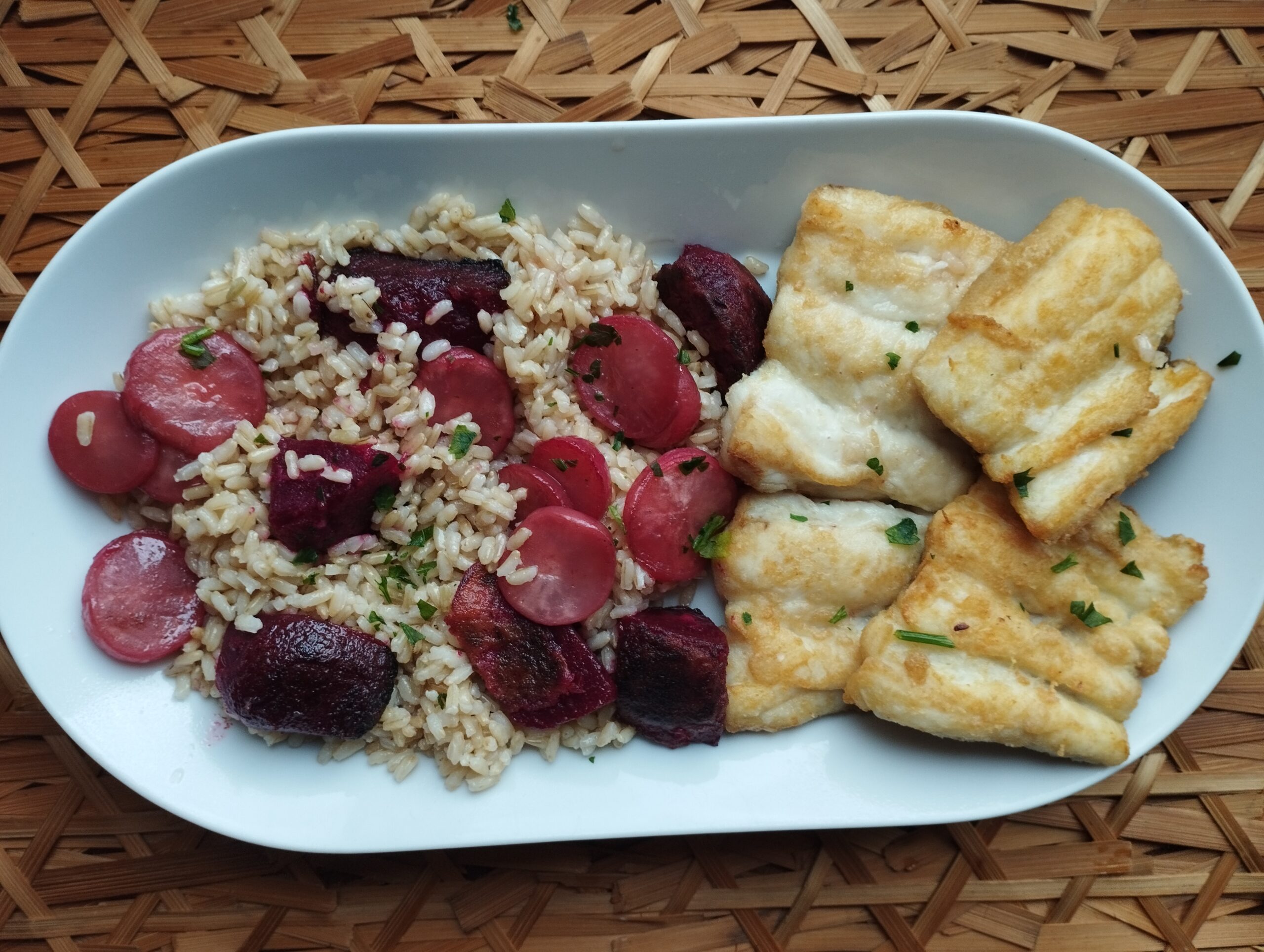Narežite rotkvice pa ih u tavi malo pirjajte na maslinovom ulju, posolite pa dodajte vino i kvasinu. Pustite na malo jačoj vatri da se tekućina reducira pa odložite sa strane. U istoj tavi na malo ulja lagano popržite narezanu ukiseljenu ciklu a u međuvremenu u posoljenoj vodi skuhajte integralnu rižu. Ona je odlična i kao prilog i za salate jer se – za razliku od riže za rižota – neće ohlađena zgusnuti u grudvice. Dobro obrisane fete/šnite ribe pospite brašnom pa pržite s obje strane da se lijepo zarumene. Služite uz rižu kojoj ste dodali rotkvice i ciklu a po volji ih začinite s malo maslinova ulja, peršina i – ako volite – čilija.